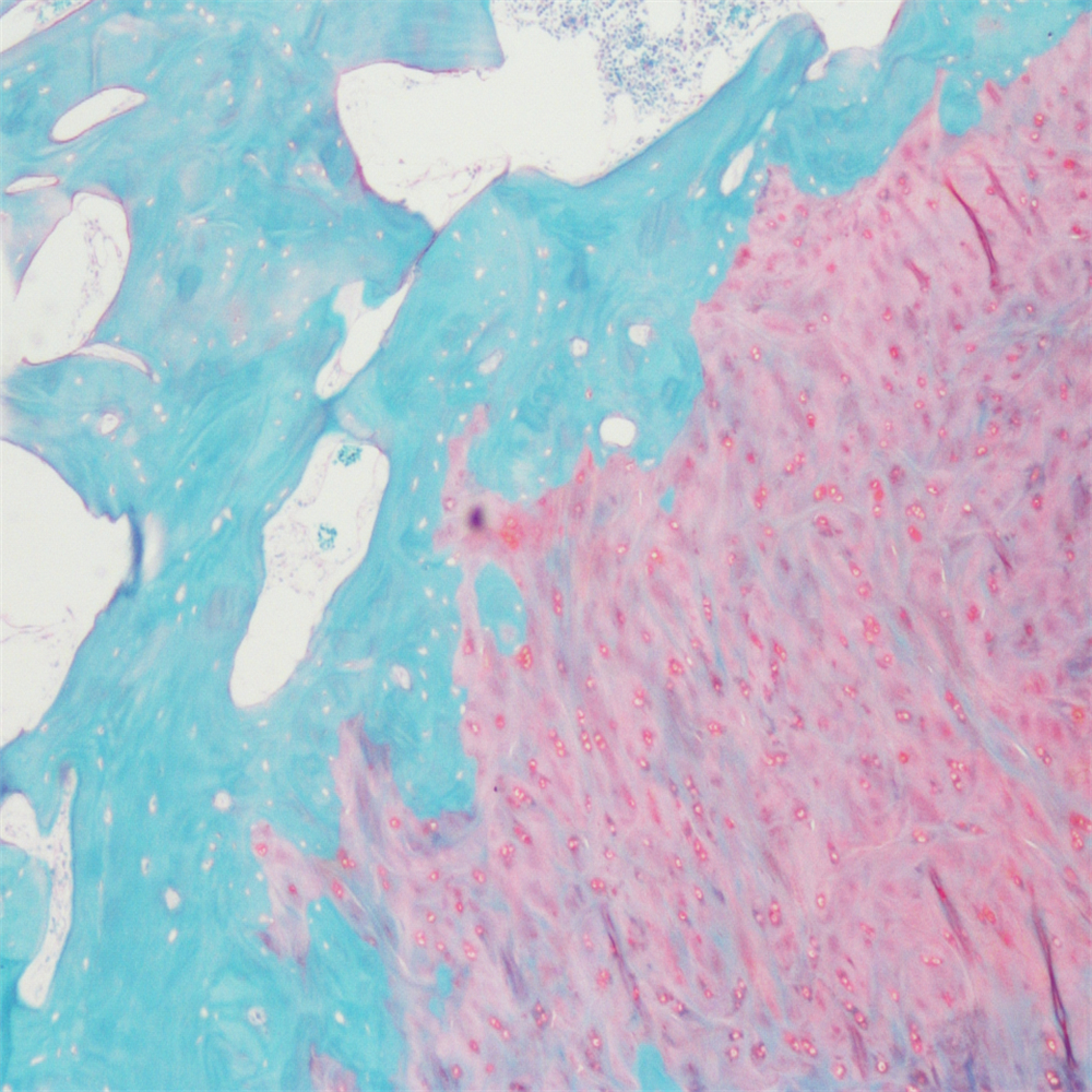 番红-固绿(软骨)染色法的染色原理在于嗜碱性的软骨和碱性染料番红O结合呈现红色,嗜酸性的骨和酸性染料固绿结合而成绿色或者蓝色,与呈现红色的软骨对比鲜明,从而将软骨组织和骨组织区分开。番红O是一种结合多阴离子的阳离子染料,其显示软骨组织是基于阳离子染料与多糖中阴离子基团(硫酸软骨素或硫酸角质素)结合。番红O着色与阴离子的浓度近似成正比关系,间接反映基质中蛋白多糖的含量和分布。当软骨收到损伤时,软骨中的糖蛋白会释放出来,使基质成分分布不均匀,从而导致番红O淡染或不着色。通过图像分析软件可以对番红O染色的软骨基质进行定量分析。固绿与胶原纤维结合,不宜褪色。